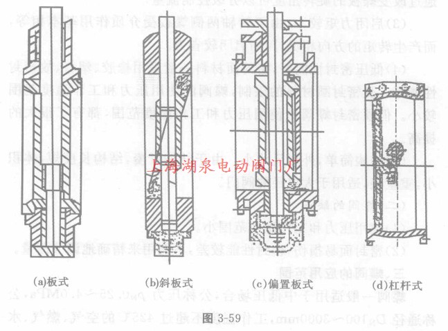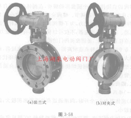 蝶閥根據連接方式分為:法蘭式、對夾式,如圖3—58(a)和(b)所示;根據密封面材料分為:軟密封、硬密封;根據蝶板在閥體中的安裝方式,蝶閥可分成:板式、斜板式、偏置板式、杠桿式。如圖3-59所示。